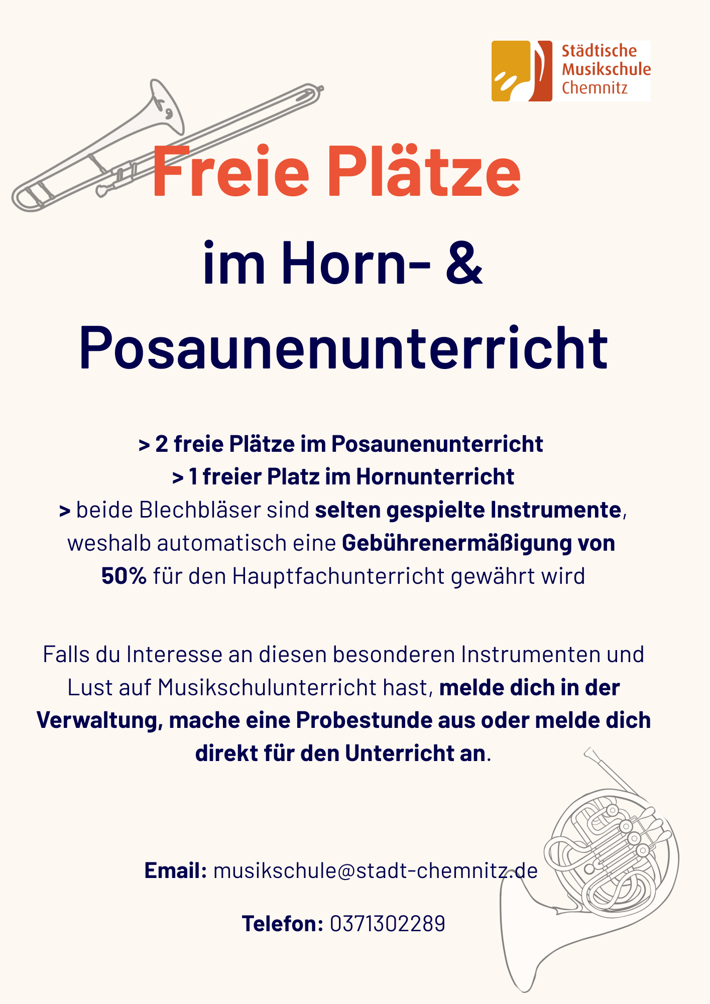 Jedes Jahr werden an der Städtischen Musikschule bestimmte Instrumente gefördert, die eher selten gespielt werden. Dieses Jahr zählen dazu das Horn und die Posaune. Für diese beiden Blechblasinstrumente wird eine Gebührenermäßigung von 50% auf den Hauptfachunterricht gewährt. Aktuell sind zwei Plätze im Posaunenunterricht und ein Platz im Hornunterricht frei. Falls du also Interesse am Lernen dieser besonderen Instrumenten hast, melde dich gerne in der Verwaltung, mache eine Probestunde aus oder melde dich direkt an!