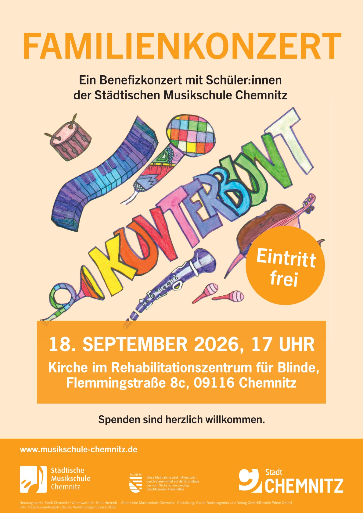 Auch dieses Jahr veranstaltet die Städtische Musikschule in der Kirche des Rehabilitationszentrums für Blinde ein “Kunterbunt”-Konzert. Verschiedene Schüler:innen und Ensembles der Musikschule präsentieren zusammen ein tolles Programm für das Benefizkonzert. Der Eintritt ist frei, Spenden sind herzlich willkommen.
