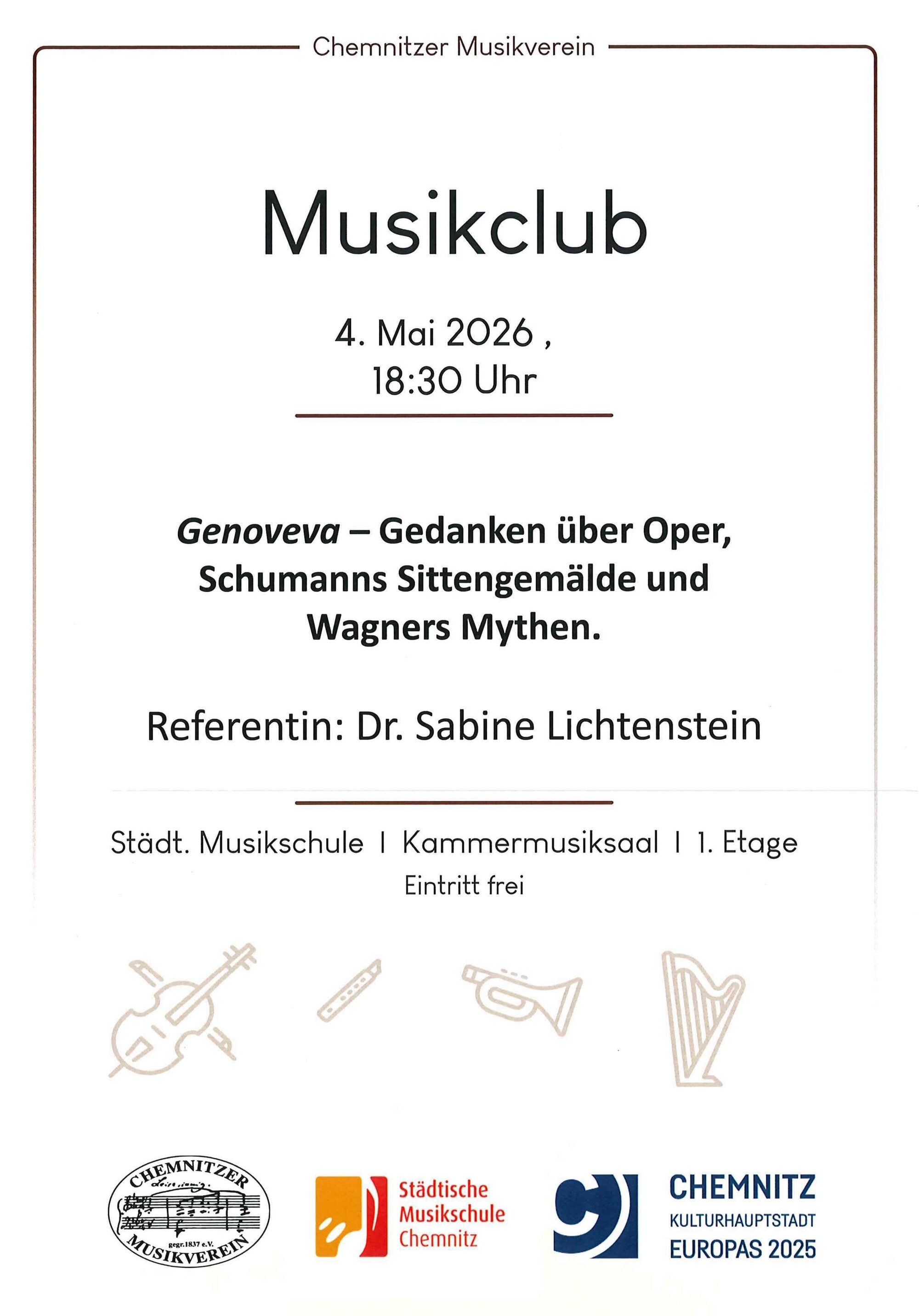 Der Chemnitzer Musikverein lädt am 04. Mai zum Musikclub mit dem Thema “Genoveva- Gedanken über Oper, Schumanns Sittengemälde und Wagners Mythen” ein. Als Referentin ist diesmal die Musikwisssenschaftlerin Dr. Sabine Lichtenstein zu erleben. Beginn ist 18:30 Uhr, der Eintritt ist frei.