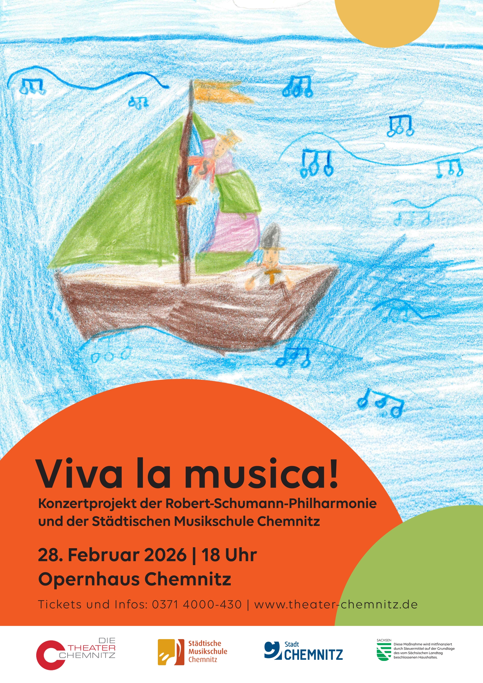 „Viva la musica!“ – „Es lebe die Musik!“. Zum gleichnamigen Konzert, welches seit 2011 regelmäßig stattfindet, kommen auch dieses Jahr wieder Schüler:innen der Städtischen Musikschule und Musiker:innen der Robert-Schumann-Philharmonie zusammen, um ihrer großen Leidenschaft für die Musik Ausdruck zu verleihen und die wunderbare und langjährige Partnerschaft zwischen den Institutionen zu feiern. Im ersten Konzertteil stellen sich die verschiedenen Ensembles der Musikschule vor, darunter die Vokalinchen, das Flitzebogenorchester und die StreichHölzer. Anschließend bringen das Jugendsinfonieorchester, der Junge Chor Chemnitz und Mitglieder der Robert-Schumann-Philharmonie das Stück Helden auf dem Notenblatt zur Aufführung. In dieser Geschichte reisen Terz und Sekund über das Notenblatt, überqueren Meere aus Triolen, erklimmen Klangberge, lösen Rätsel und lernen sogar Zaubersprüche. Ein vielseitiges Konzert für die ganze Familie voller Leidenschaft für die Musik!